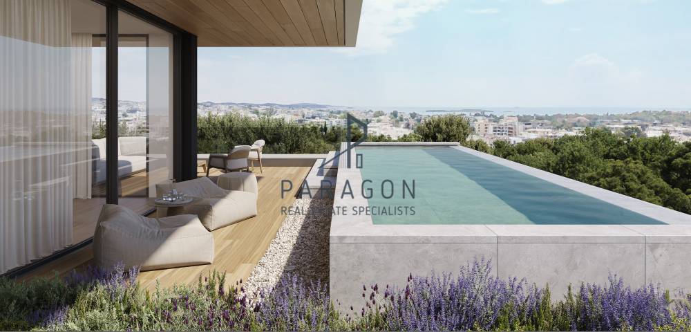 Glyfada, Aixoni: Penthouse maisonette 231 sq.m. for sale. 2nd and 3rd floors with autonomous heating. It consists of 2 bedrooms, 1 of which is a master, 1 kitchen, 1 living room, 13 sq.m. warehouse, bathroom and 1 wc. It has a sea view, roof garden 101 sq.m. with a 24sq.m pool, aluminum frames with double glazing, security door, 2 internal parking spaces, service room with cour inglese and laundry room with a total area of 63sq.m. in the basement, energy class A+. The property has the following layout: 2nd floor: 147sq.m, loft: 48sq.m. Price €2,200,000 | Property Code: #13618